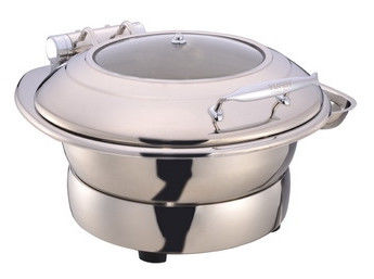 The Round mechanical hinge induction chafing dish is designed with elegant appearance and with practical function. The dish itself can compatible with induction plates or ablong with matching frame for a more classic buffet environment. Heat source like induction plates, electrical warmer and sterno are all suitable. The patented mechanical/hydraulic mechanism gives an extremely smooth lid motion. Gentle & silent opening & closing of lid which helps to define the class of a buffet. Used for hotel, KTV, commercial big canteens, commercial restaurant, cafeteria, catering industry, etc.